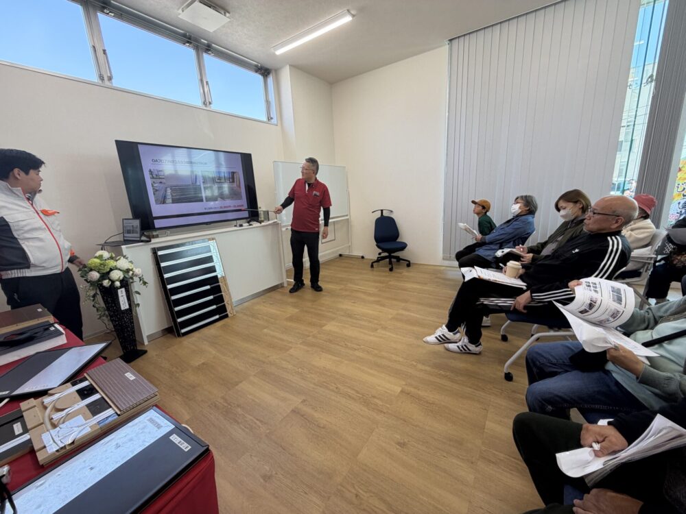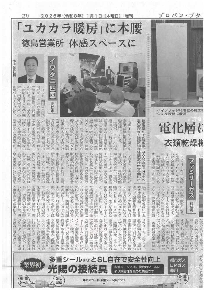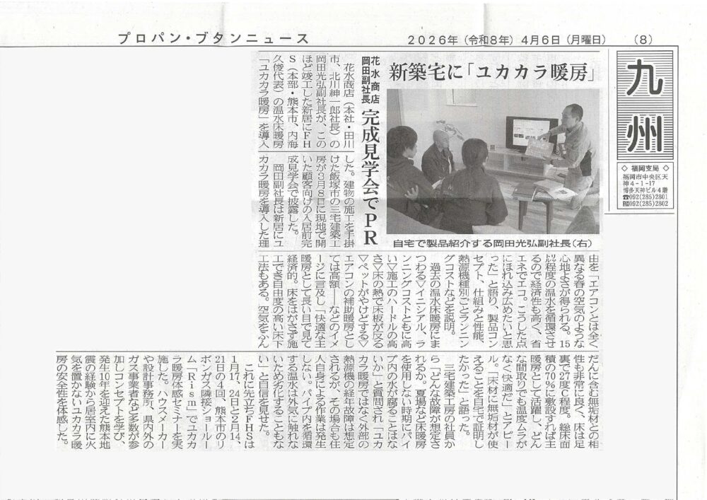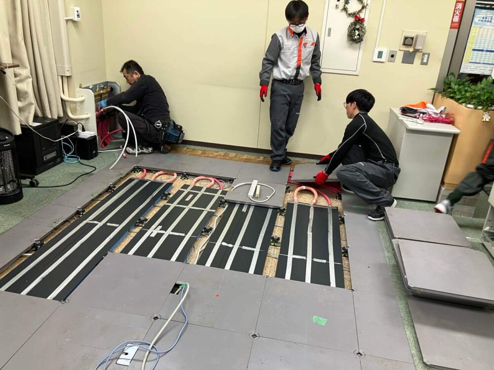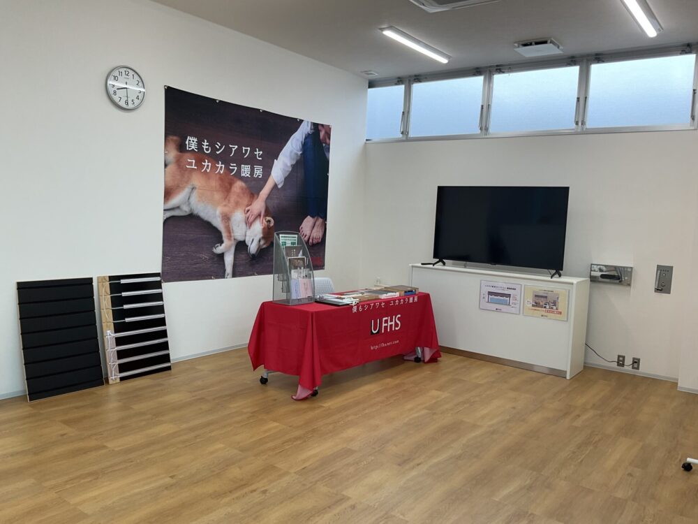 リボンガス株式会社に隣接するショールームにて、「ユカカラ暖房」を体験することができます。床暖房の仕組みも説明し、図面等あれば打ち合わせも行えます。