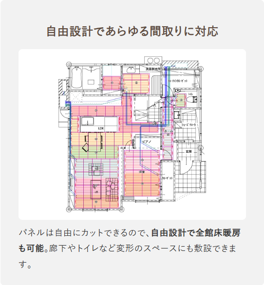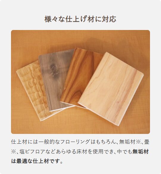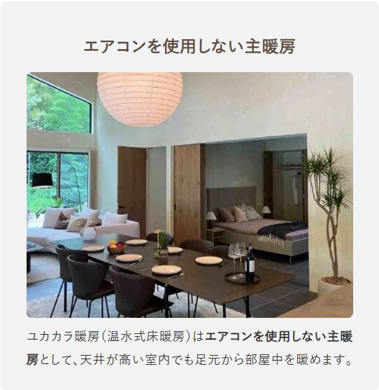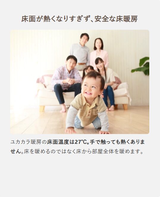 温水式床暖房「ユカカラ暖房」はエアコンを使用しない主暖房であり、床が熱くなりすぎず無垢材のフローリングや全館床暖房にも対応できます。健康長寿に対する関心の高まりと高騰するエネルギー価格に対応するためにも「Well-being」と「Sustainability」を両立できる空調として、ユカカラ暖房をどうぞお役立てください。