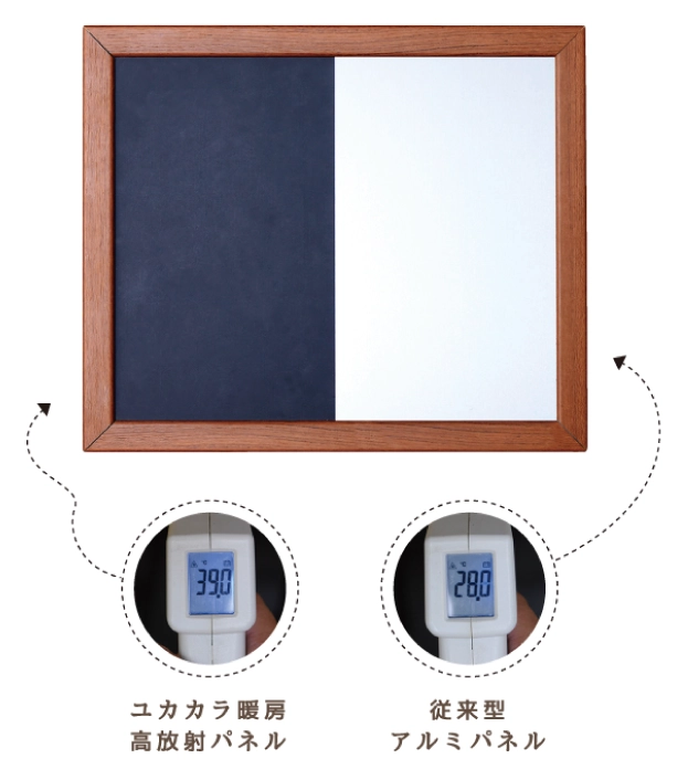 ユカカラ暖房のブラックパネル(黒色塗装)にはセラミック粒子が配合されており、暖炉や薪ストーブ、遠赤サウナのように体の芯から暖まります。